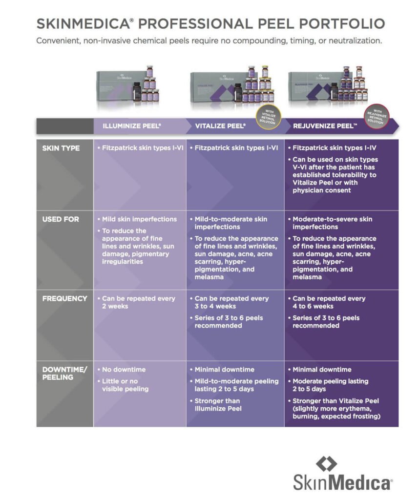 Each SkinMedica® peel is administered by a licensed skincare professional and includes a thorough skin evaluation prior to treatment. Mild peeling or